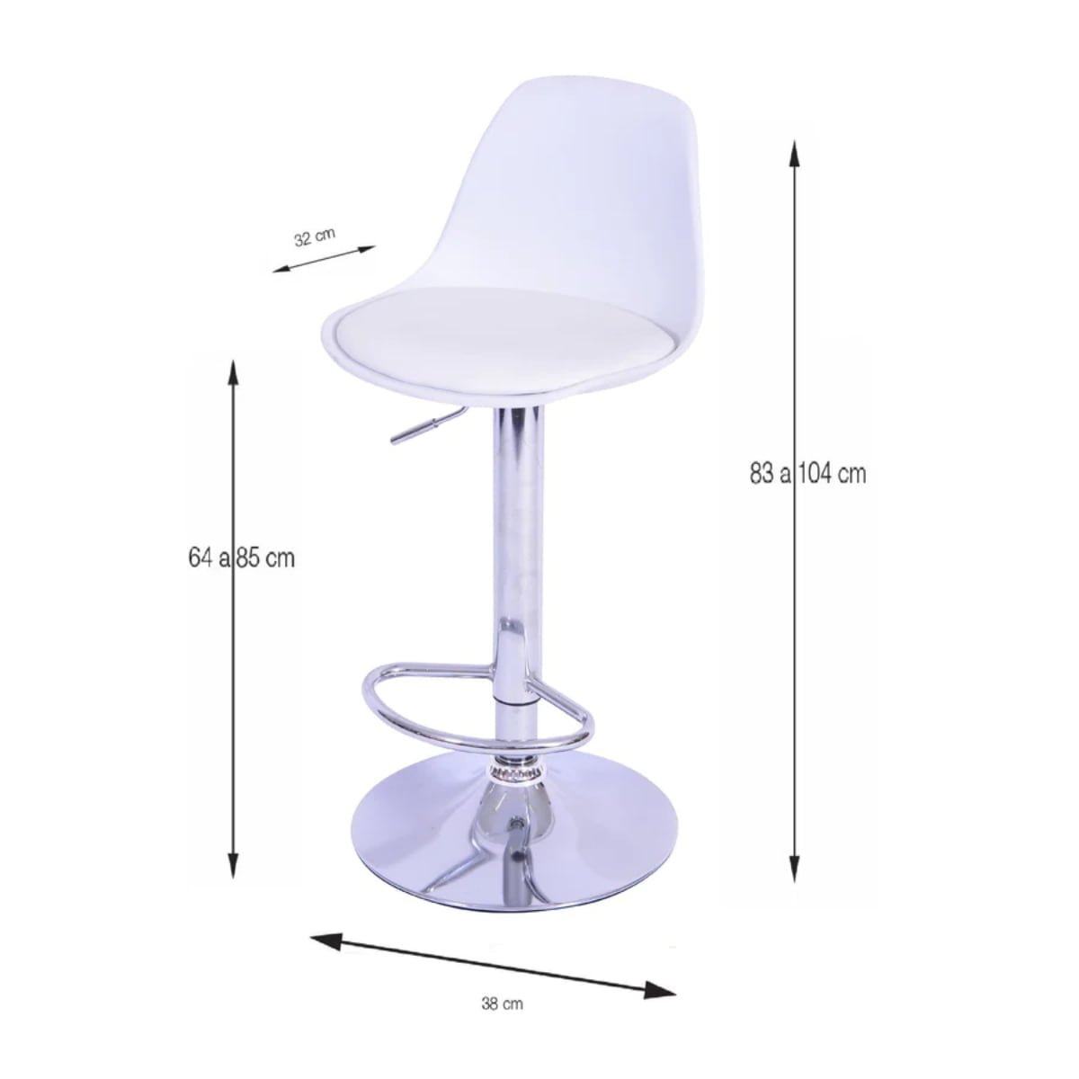 Banco para barra, cómodo, elegante, ideal para crear espacios innovadores, asiento con espuma interna, tapizado en sintético, posa pies metálico, base circular cromada con tapete anti rayones, Color: blanco, negro.