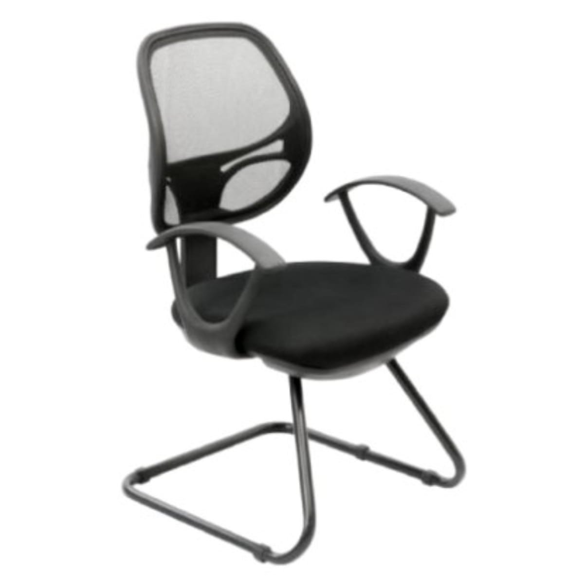 Silla interlocutora, ideal para mesas de juntas y atención al público, espaldar marco de polipropileno de alto impacto, malla traslucida de alta resistencia, estructura metálica tipo trineo pintada en color negro, apoya brazos fijos, asiento en espuma de alta densidad, tapizado en tela antitranspirante.