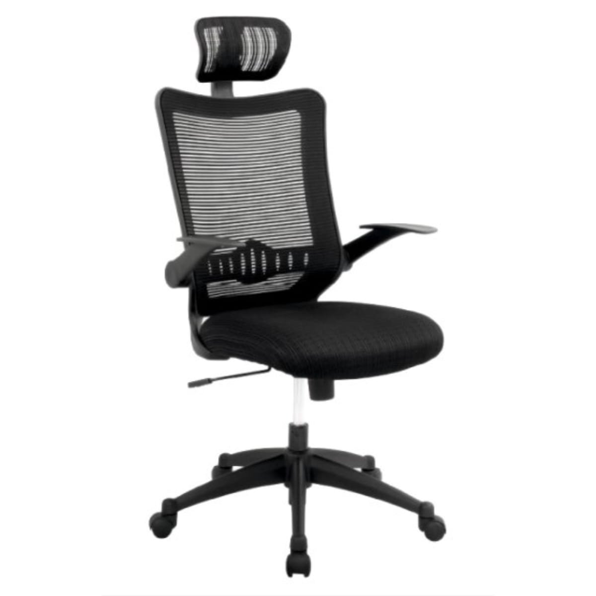 Silla presidencial ergonómica, cómoda, ideal para largas jornadas laborales, cabecero graduable en altura, espaldar en malla negra traslucida de alta resistencia, apoya brazos abatibles, asiento en espuma de alta densidad, base nylon de alta resistencia, rodachinas de suave rodamiento y rápido cambio de dirección.