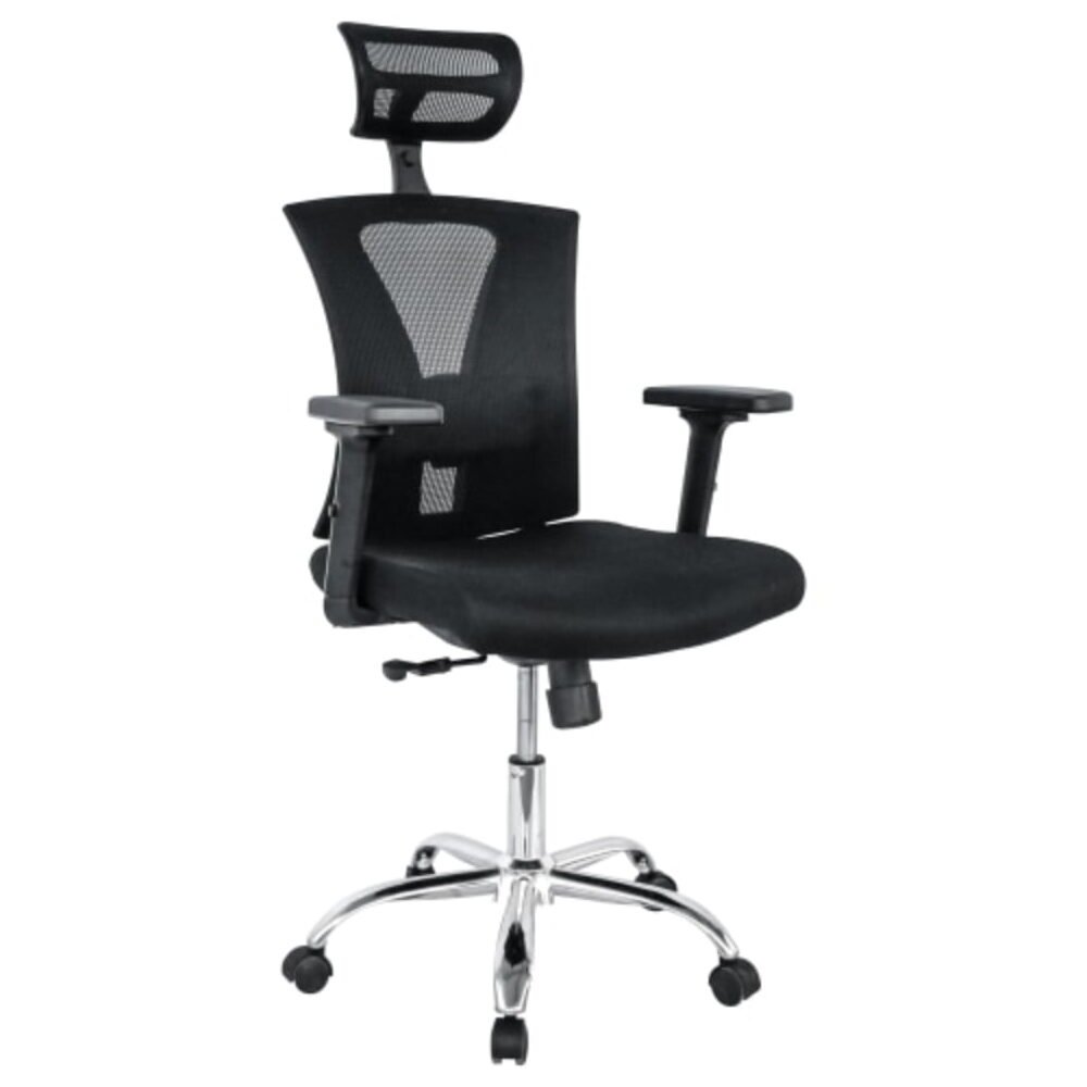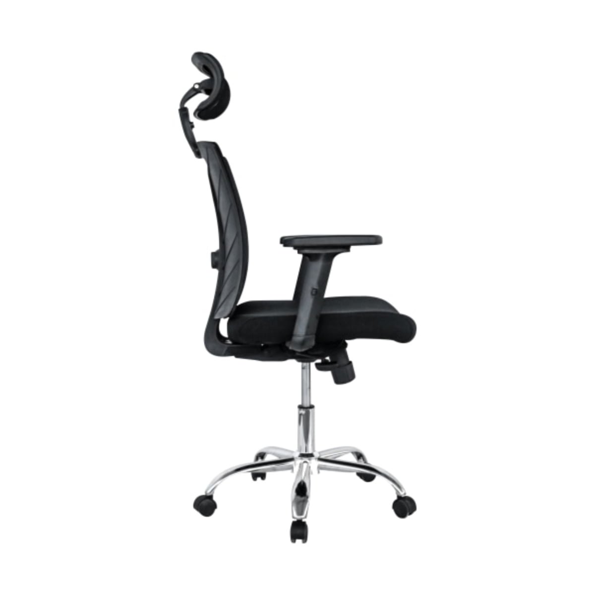 Silla Presidencial ergonómica, cómoda, especial para largas jornadas de trabajo, cabecero graduable en altura, marco del espaldar en polipropileno con un diseño elegante e innovador, espaldar en malla negra traslucida de alta resistencia, soporte lumbar graduable en profundidad, brazos graduables en polipropileno, asiento en espuma de alta densidad, tapizado en tela micro suave, base metálica, rodachinas de suave rodamiento y rápido cambio de dirección.